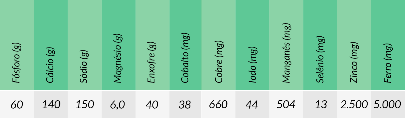 Consumo estimado: 70 a 90g diários por UA (unidade animal – 450 kg de peso corporal)