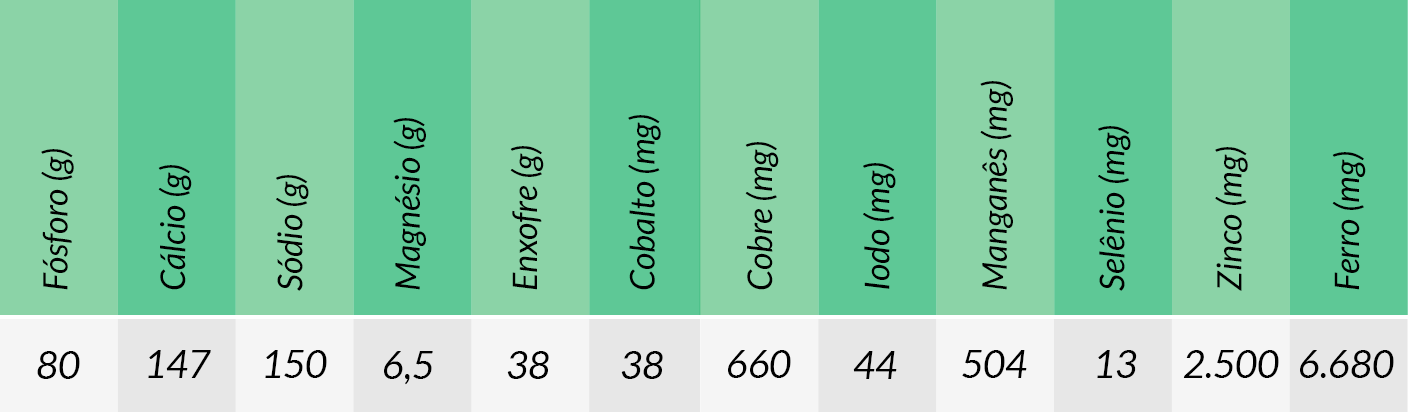 Consumo estimado: 100 a 120g diários por UA (unidade animal – 450 kg de peso corporal)