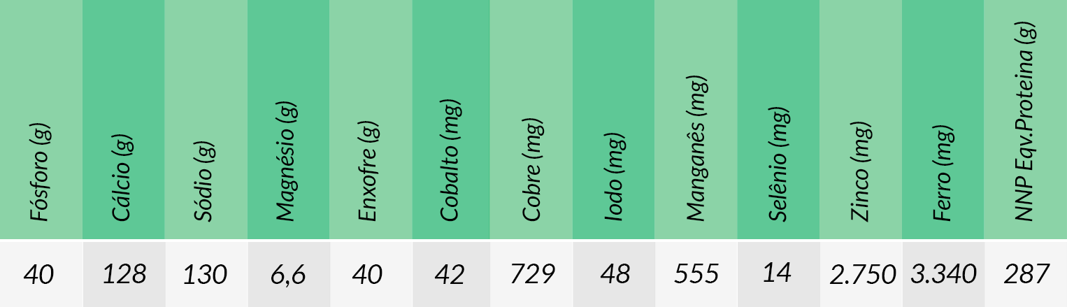 Consumo estimado: 100 a 140g diários por UA (unidade animal – 450 kg de peso corporal)