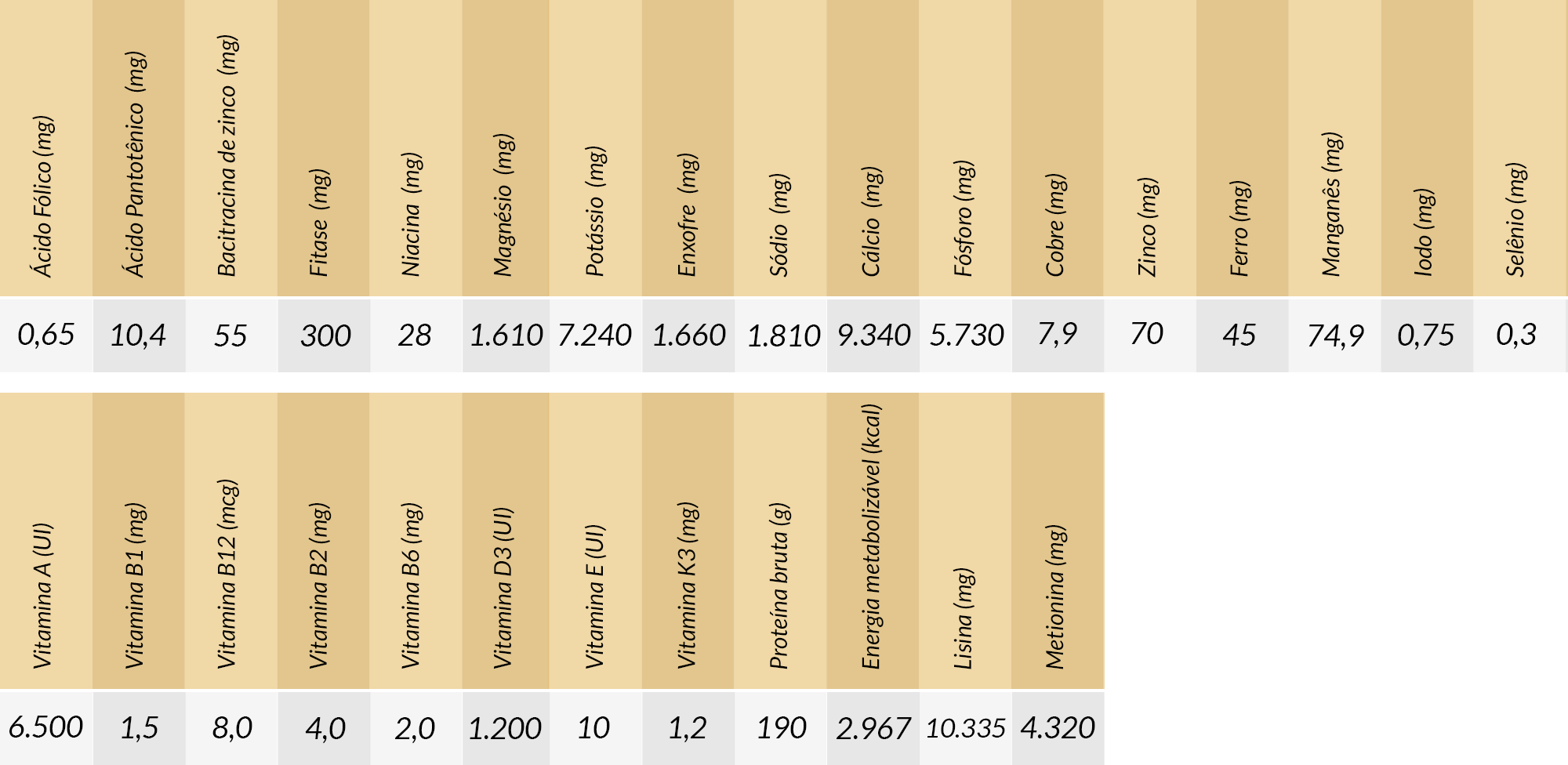 Modo de uso: Produto de pronto uso. Fornecer a vontade às aves em crescimento e engorda a partir dos 22 dias de idade.