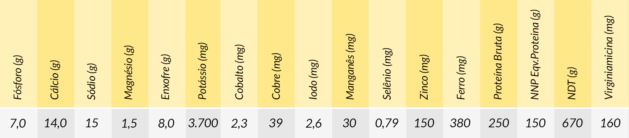 Modo de uso: Produto de pronto uso, de fornecimento diário, em cochos preferencialmente cobertos. Para viabilizar o acesso de todos os animais ao suplemento, respeitar espaçamento mínimo de 30,0 cm lineares por UA.