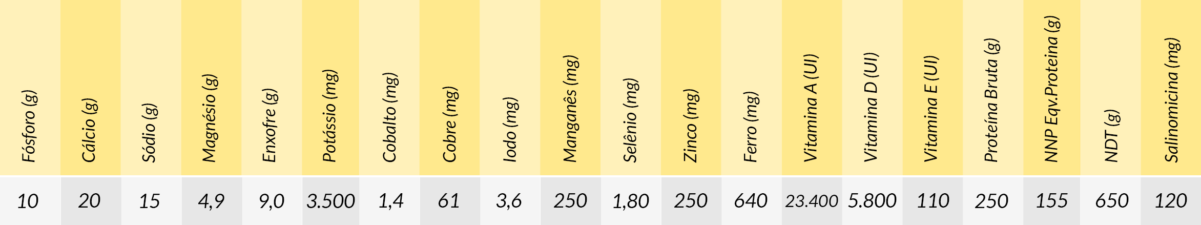 Modo de uso: Produto de pronto uso, de fornecimento diário, em cochos preferencialmente cobertos. Para viabilizar o acesso de todos os animais ao suplemento, respeitar espaçamento mínimo de 30,0 cm lineares por UA.