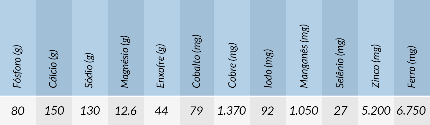 Consumo estimado: 100 a 120g diários por UA (unidade animal – 450 kg de peso corporal)