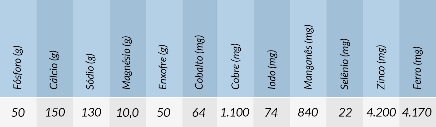Consumo estimado: 80 a 100g diários por UA (unidade animal – 450 kg de peso corporal)
