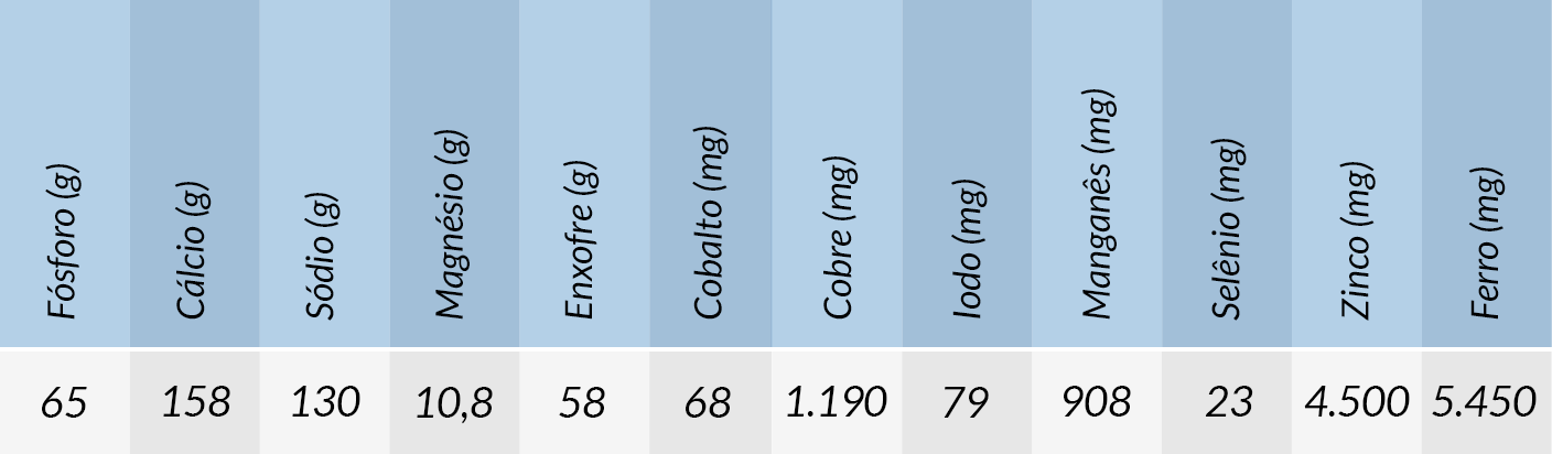 Consumo estimado: 70 a 90g diários por UA (unidade animal – 450 kg de peso corporal)