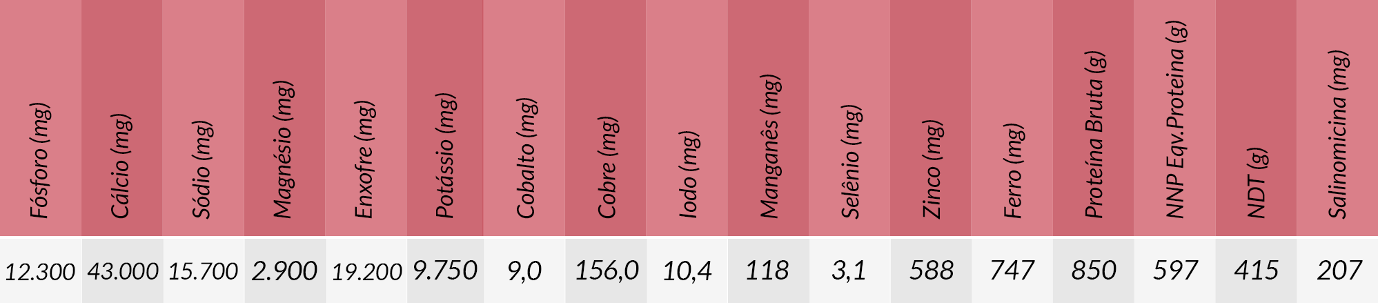 Concentrado mineral proteico, aditivado com salinomicina, indicado para formulação de rações para bovinos em fase de terminação em sistema de confinamento e semiconfinamento. Além da fórmula padrão, existe a possibilidade de adequação à particularidades.